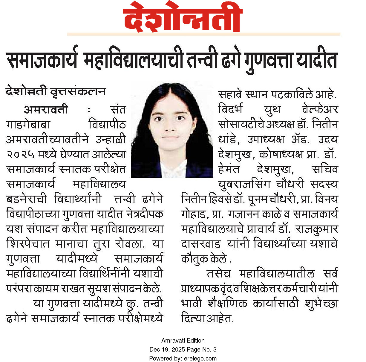 Located on Anjangaon Bari Road in Badnera, Amravati, the College of Social Work offers comprehensive education and training programs aimed at fostering professional skills and social responsibility. The college is dedicated to empowering students with the knowledge and practical experience needed to make a positive impact in the field of social work.